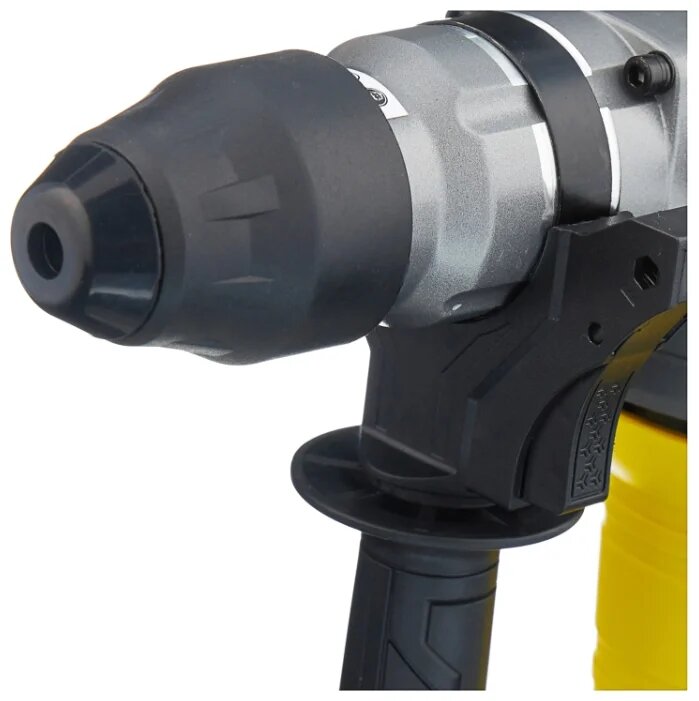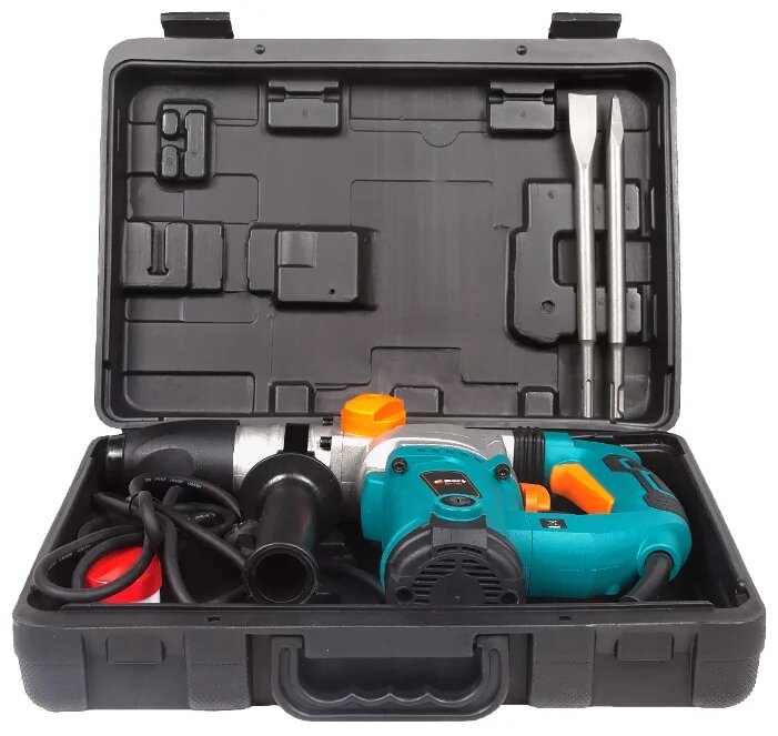 боковая рукоятка, ограничитель глубины сверления, 3 бура, пика, зубило, ключевой патрон, пыльник, кейс